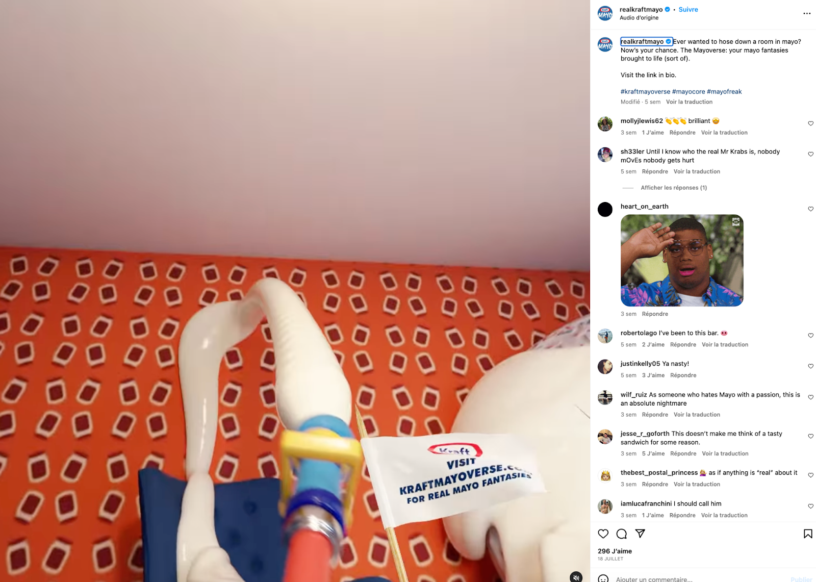 Vous n’en rêviez pas, et pourtant Kraft l’a fait : “an immersive experience inspired by real fans’ mayo fantasies shared on Reddit and Twitter. The Mayoverse features four unique rooms: Mayo House, Mayocean, Mayobot, and Mayo Bas. Each room offers online visitors the chance to enter one another’s dreams and even commemorate the moment with a selfie postcard and a souvenir from the gift shop.” (source) Hélas, le site ne me semble plus accessible aujourd’hui… dommage, car vous pouviez apparemment recouvrir une pièce entière de mayo.
